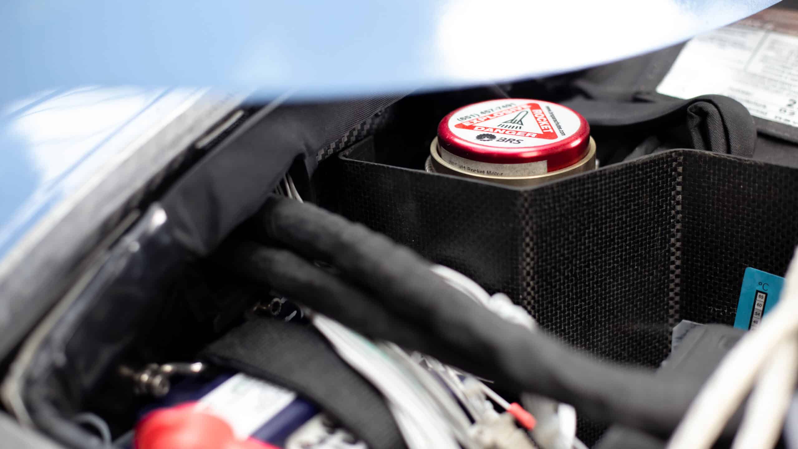 Le parachute : presque trop facile. Le parachute et sa roquette sont situés sous le capot moteur, dans leur propre compartiment. Pour son entretien, enlevez simplement le capot. |